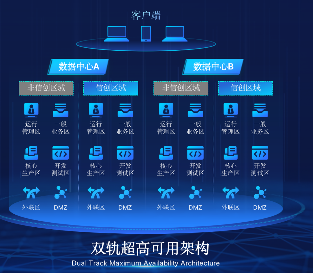 Ezpay在企业面临自主创新IT基础重构过程中,推出的全新架构双轨超高可用架构(简称DTMAA),在双活数据中心的分区调度基础上,添加每个数据中心内信创域和非信创域的分域调度,来实现分区分域协同的多活双轨超高可用。